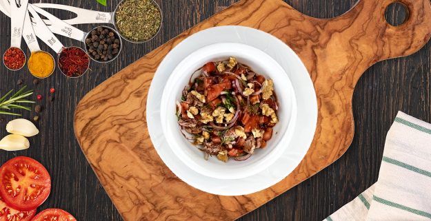 Malzemeler: Bahar Hindi Tandır 240 GramDomates 1 AdetKırmızı Soğan 1 AdetMaydanoz ½ BağCeviz 1 AvuçZeytinyağı 1 Yemek kaşığıPul BiberNar Ekşisi