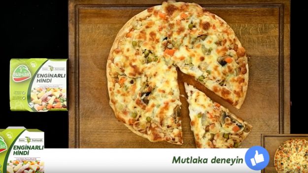 Malzemeler: BAHAR ENGİNARLI HİNDİ 330 gram Orta Boy Hazır Lavaş 8 adet Ketçap veya Pizza Sos Yeteri kadar Mantar 4 adet orta boy Yeşil Dilimlenmiş Zeytin 4 yemek kaşığı Rendelenmiş Mozzarella 300 gr Yaprak Kekik 1 cay kaşığı dolusu