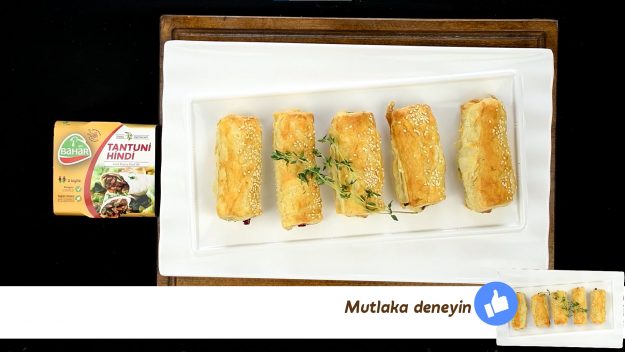 MALZEMELER BAHAR HİNDİ TANTUNİ 495 gram Maydanoz 1 çorba kaşığı dolusu doğranmış Taze Nane 1 tatlı kaşığı doğranmış Dereotu 1 tatlı kaşığı doğranmış Rende Kaşar Peynir 150 gram Milföy Hamuru 8 adet Yumurta 1 adet börek üstüne sürmek için Susam İstege bağlı üstüne serpmek için